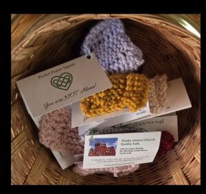 Upon the conclusion of the service, Eleanor says “the congregational response was overwhelming! I was inundated by members of the congregation reaching out to shake my hand and pass me folded bills while saying, “Please put this money toward your postage costs”. (In my enclosed letter to Pastor George Rowe, of Tumbler Ridge Baptist Church, Rev. Takouhi asked me to enclose a copy of her book to Pastor George, as well as “pocket prayer squares,” hand knit by Trinity members, to be distributed by Pastor George to whomever he wished.